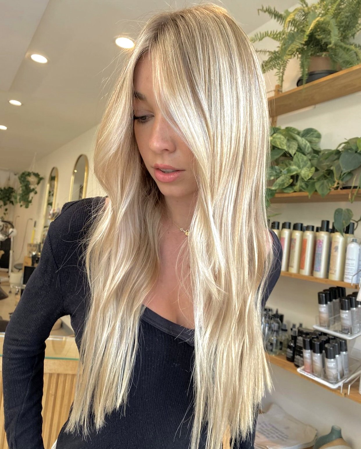 Balayage is a French word that means “to sweep.” With this technique, highlights are hand-painted or “swept” on the surface of the of hair. Lightener is painted on, starting midshaft and becoming denser as it moves down the section of hair to the ends. The results are natural, sun-kissed highlights and placement may be customized for each guest. In this photo, our guest asked for bright bold ribbons of blonde with a balance of dimension.